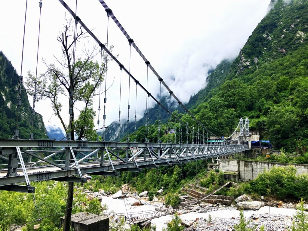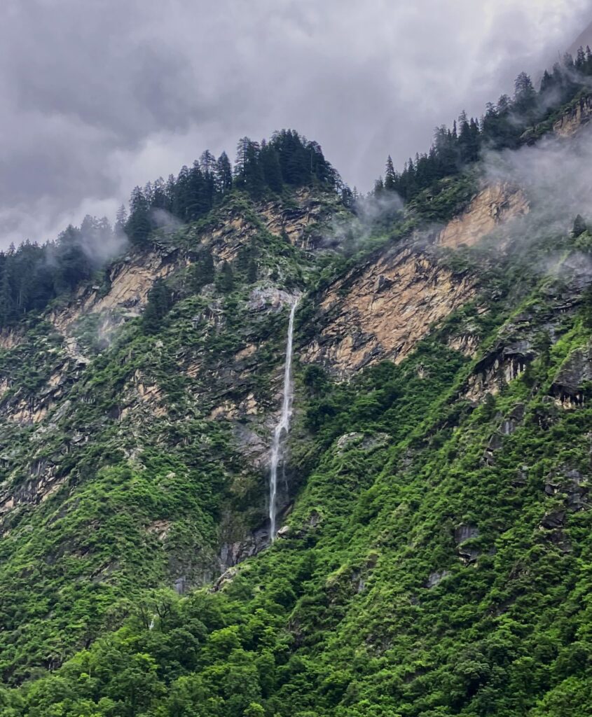 After breakfast, we began our trek to Ghangaria, the base village for the Valley of Flowers and Hemkund Sahib. It was a beautiful trek along the river, though a bit steep uphill. This 8-9-kilometer journey offered outstanding views of forests, towering mountains, and waterfalls that looked like water falling from the sky. After hiking for 1.5 hours, we reached Bhyundar Village and then crossed a giant bridge, finally arriving at Ghangaria Village around 1:30 PM. The village is nestled at an elevation of 3,000 meters (9,800 feet).