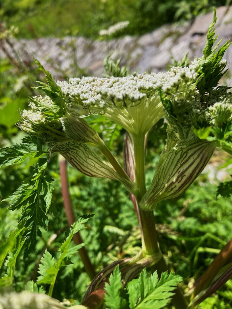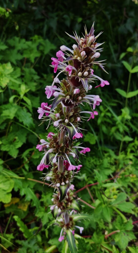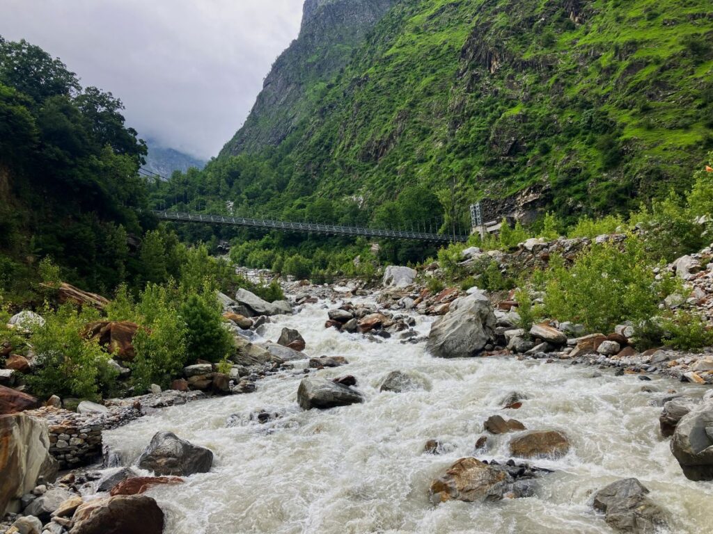 After just 30 minutes of hiking, I fell in love with the area’s biodiversity—one of the best I’ve ever seen. The trail is made of stone, with hundreds of flowering plants and bushes on the sides. We entered a beautiful forest with old silver firs, spruces, deodar trees, and Bhojpatra and viburnum bushes. This is a perfect habitat for Himalayan Brown Bears, so it’s dangerous to walk here late in the evening. After this forest patch, the trail leads to the bank of a river. We crossed a bridge, and the trail became a steep, zigzag uphill path for 1.5 kilometers, which felt like 5 due to the gradient, a little difficult part of the trek.